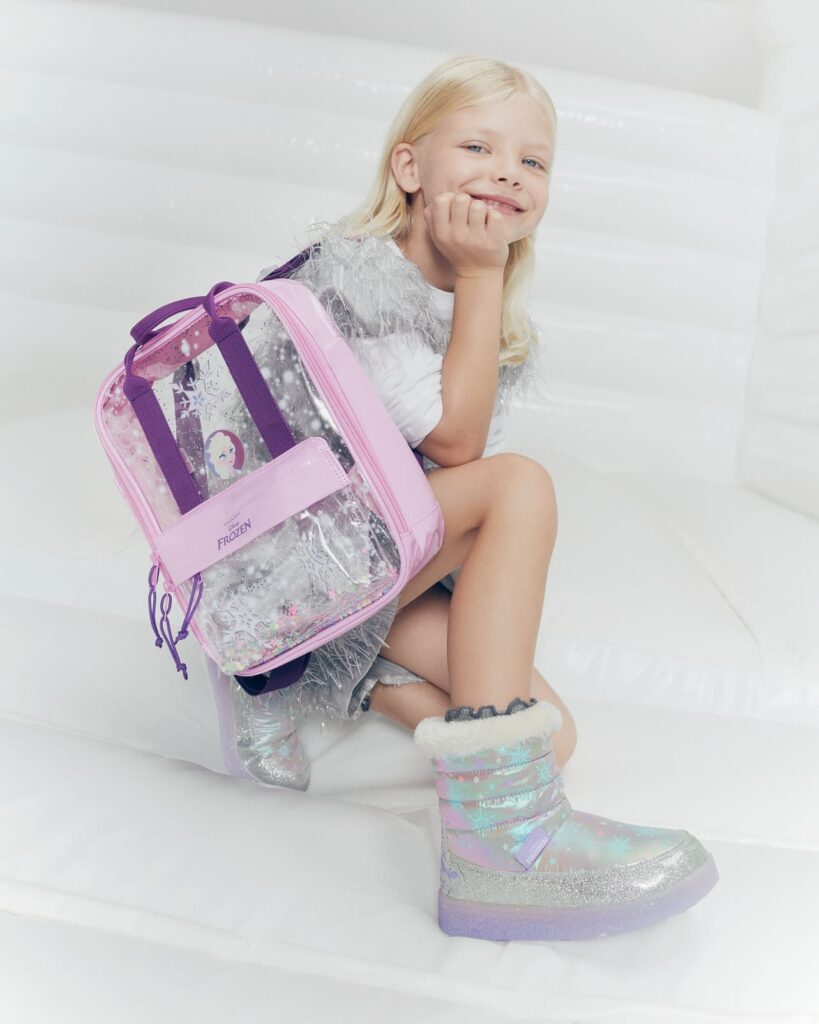 Postavičky z Frozen sa objavujú na školských taškách, fľašiach, perinách a najmä na detských topánkach – či už ide o tenisky s blikajúcimi svetielkami, sandálky alebo gumáky. Pre dievčatá sú tieto produkty jedny z najžiadanejších pri nástupe do školy či škôlky.